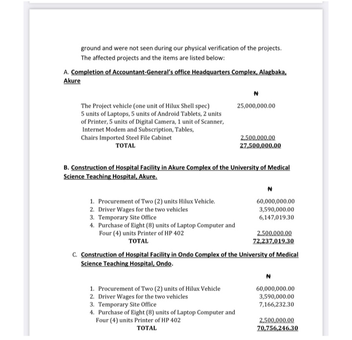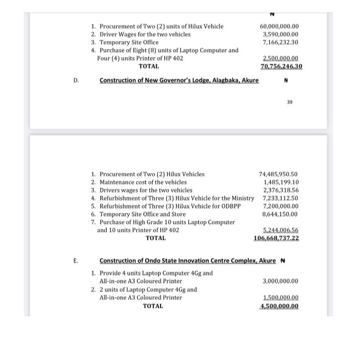 N70.7 million worth of items for the construction of the governor’s lodge, including two Hilux vehicles, maintenance costs, and refurbishment of vehicles.