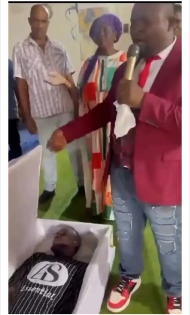 In the video, a young man is seen lying in a coffin as the pastor claims to have received a prophecy from God indicating that it’s not yet the young man’s time to pass on.